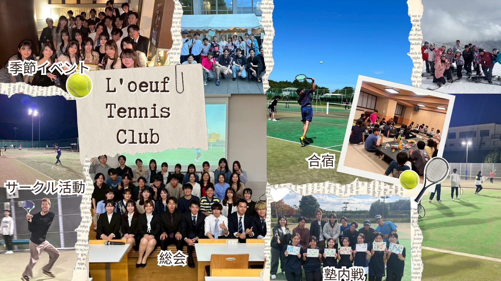 比較的少人数のサークルなので、全体の仲が良く、和気あいあいとした雰囲気が魅力です。年に3回のテニス合宿のほか、クリスマスパーティーやスキー合宿などイベントも盛りだくさん!